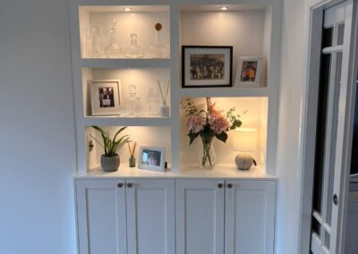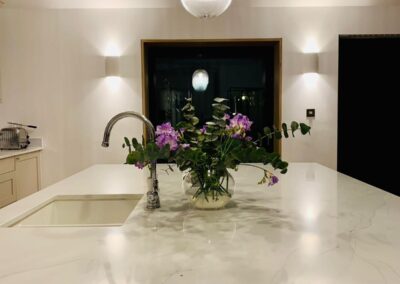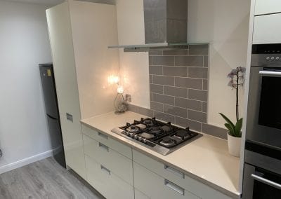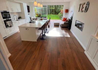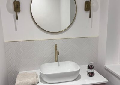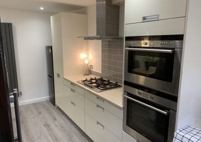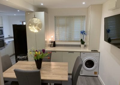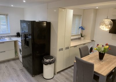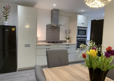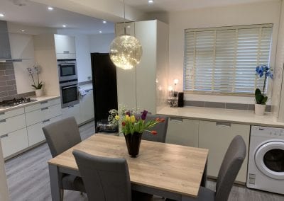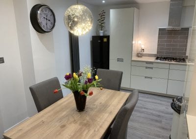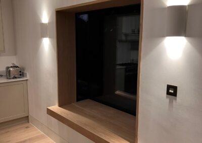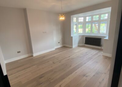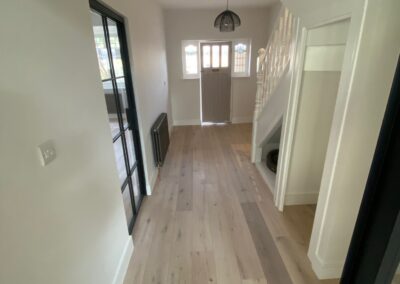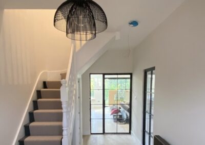 This was a full internal refurb project with the aim of creating the perfect family home for our clients. Finished to a high specification with an eye for design, we completed a full width ground floor wrap around extension, creating a new large open plan kitchen, dining and living space with a beautiful bespoke oriel window overlooking the garden. In addition, we completed a full electric re-wire to the property, fit new flooring and doors throughout, added underfloor heating, reconfigured the master bedroom to create a walk-in wardrobe and en suite, renovated the family bathroom and redecorated throughout.