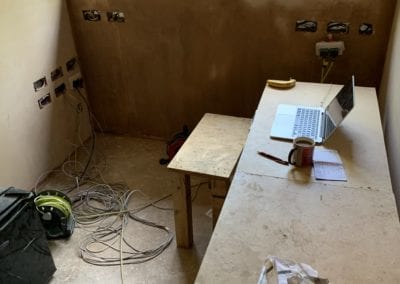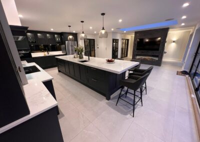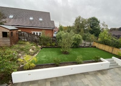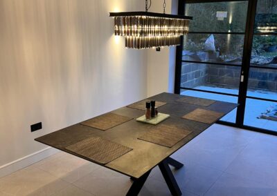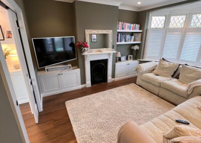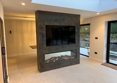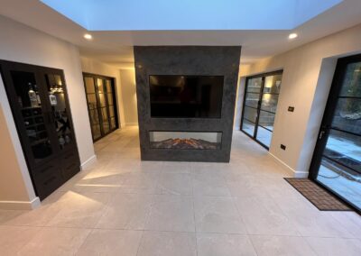 This project comprised of a full width ground floor rear extension, creating a new extra-large open plan kitchen, dining and living space, with a bespoke Venetian plastered media wall, separate utility room and downstairs shower room. We also added underfloor heating, new internal doors, created a bespoke kitchen mantle to seamlessly match the new shaker style kitchen design and landscaped the multi-level back garden to create an inviting outdoor space for the whole family.