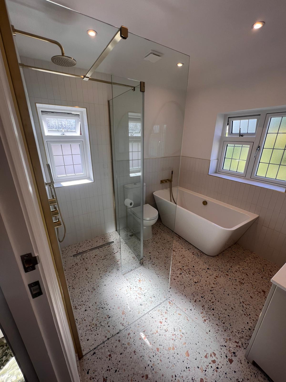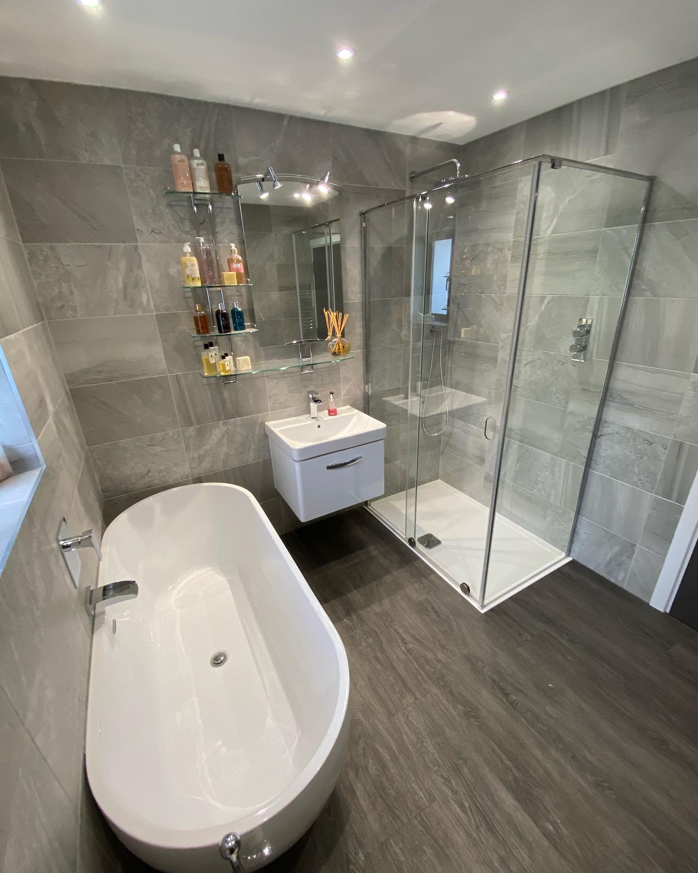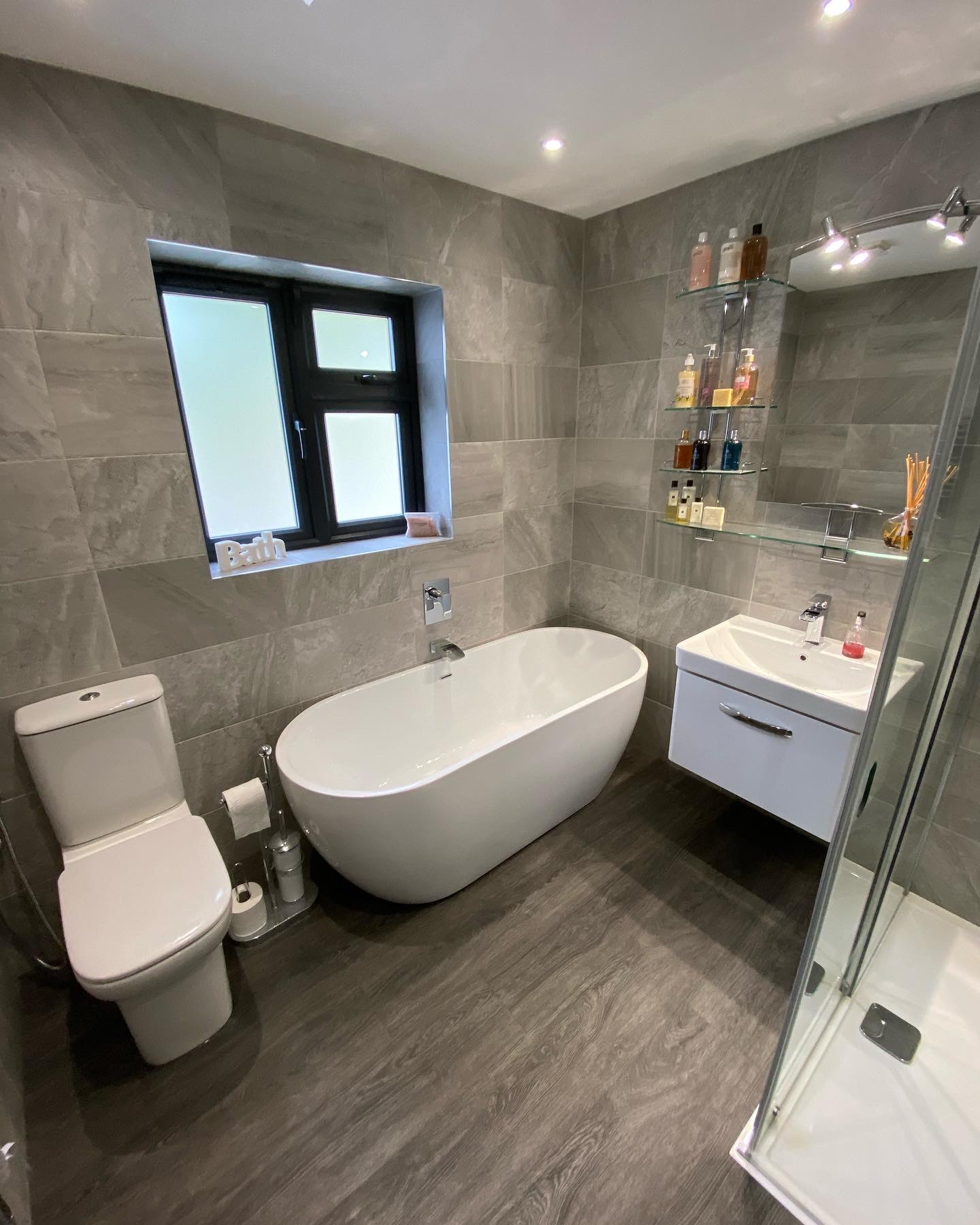 One of our 2022 standalone bathroom projects saw us take an old bathroom and separate WC and transform it into a beautifully designed family bathroom. With a walk-in shower, semi-freestanding bath, luxury tiling and matching tap ware, this bathroom is both fully-functional for the entire family and uber stylish.