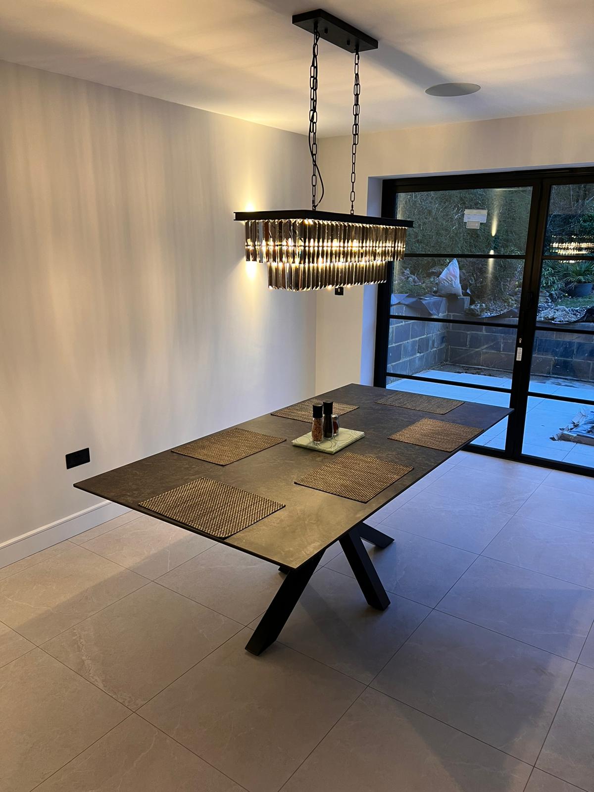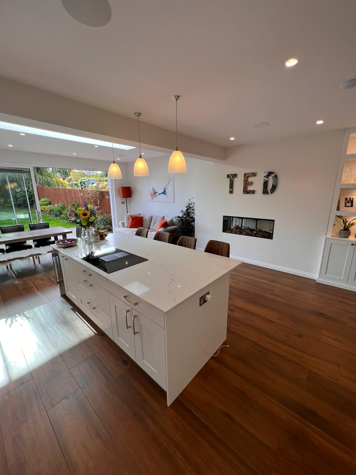 This project comprised of a full width ground floor rear extension, creating a new extra-large open plan kitchen, dining and living space, with a bespoke Venetian plastered media wall, separate utility room and downstairs shower room. We also added underfloor heating, new internal doors, created a bespoke kitchen mantle to seamlessly match the new shaker style kitchen design and landscaped the multi-level back garden to create an inviting outdoor space for the whole family.
